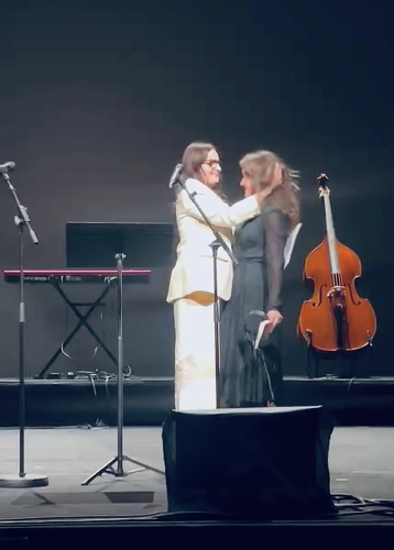 В мене поки немає кращих фотографій, але це Жюльєт Бінош тепло обіймає мене на сцені після того, як вона декламувала французькою переклад мого вірша.