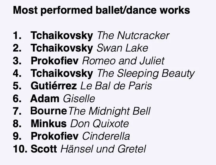 This year, there remains a marked interest in all of Matthew Bourne’s works: *The Midnight Bell* took 7th place, whilst *The Red Shoes* came 16th among the most frequently performed dance works.
