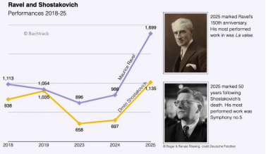 Протягом останнього десятиліття, відзначає Bachtrack, ми спостерігали стабільне зростання популярності Моріса Равеля в наших списках. 2025 рік ознаменувався 150-річчям композитора, тому не дивно бачити його твори серед найбільш виконуваних концертних робіт: «Вальс» (La Valse) та Фортепіанний концерт соль мажор посіли місця в першій п'ятірці. (Цього року «Чотири пори року» Вівальді стали найбільш виконуваним концертним твором у наших списках, що, можливо, є наслідком великої кількості виступів камерних оркестрів, які ми враховуємо).