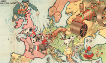 Французька версія британської карикатури Hark! Hark! The Dogs Do Bark! 1914 р. Росію уособлюють ведмідь і цар на паровому катку
