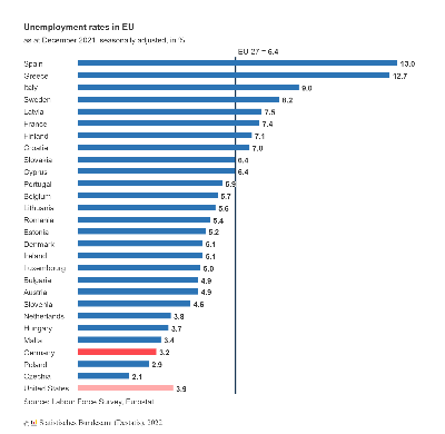 В декабре 2021 года средний уровень безработицы в ЕС составил 6,4% (7,0% - с поправкой на сезонность), снизившись с 7,5% (8,2%) в декабре 2020 года. Уровень безработицы среди молодежи в декабре 2021 года составил 14,9% как в ЕС, так и в еврозоне, что ниже соответствующих (15,3% и 15,4%) показателей за прошлый месяц.