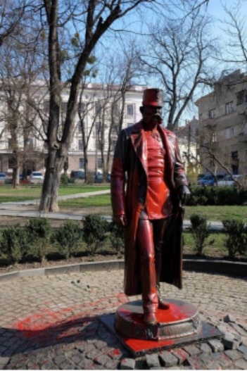 Однак у австрійського імператора веселка зовнішніх впливів була ще багатшою. Через якийсь час цей пам'ятник, від голови до ніг, облили фарбою. Раз від голови до ніг (а не тільки пальці), так і колір відповідний - червоний. Мотиви і зв'язки, що раніше спліталися в моїй свідомості у вузли витончених метафор, задубіли: вторгнення червоного завжди таке.